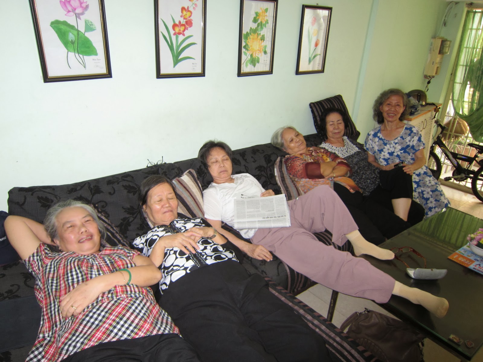 Tuy rằng đúng ngày 7-11 không gặp nhau được, nhưng mấy bà già không chịu bỏ cuộc, lại hẹn nhau ngày 9-11. Chúng tôi gom được 6 cụ, rất vui mừng là ngày hôm ấy không mưa, không ngập. Mỗi người làm một viêc, cứ như là có tiệc lớn, thực ra chỉ có bánh đa cua, bánh giầy kẹp chả và một món truyền thống là bánh mì đen với bơ. Một chiếc bánh mì đen chính gốc từ Moskva do con của bạn Nhu vừa mới đem về. Không có rượu, chúng tôi nâng ly bằng bia. Ly thứ nhất mừng CMT10 Nga, ly thứ hai chúc mừng cho Đặng thị Nhu, ngày đầu tiên đi bằng hai chân sau đúng 2 năm chống nạng. Cách đây 2 năm, chúng tôi kỷ niệm CMT10 Nga ở nhà tôi (Cách nhà Lệ một con sông Sài Gòn). Tan tiệc, Nhu về nhà Lệ chơi và ngã tại đó, phải đi cấp cứu, gãy xương háng. Sau khi ăn uống, các cụ ngả lưng và khoe những đôi chân dài (rất tiếc là tôi không đem theo máy ảnh, nhưng bạn Nhu thì có chụp, bạn ấy sẽ cung cấp ảnh sau). Sau một giấc nồng, các cụ uống trà và ăn bánh, hát bài hát ca ngợi Lenin, giọng vẫn vang xa và hát khá hay.